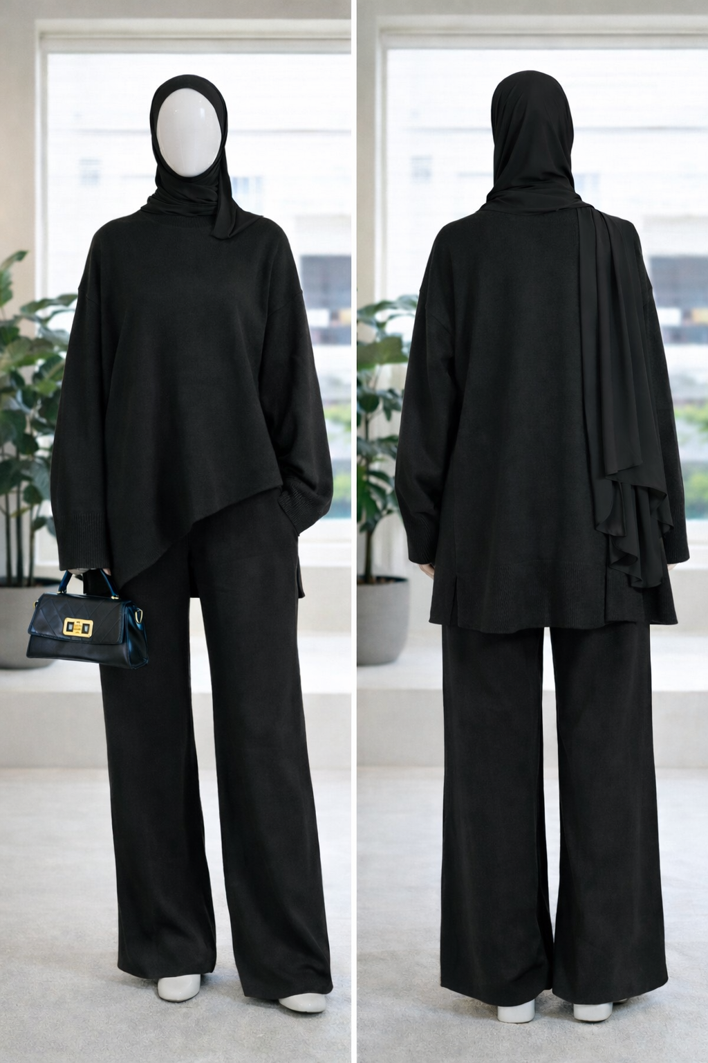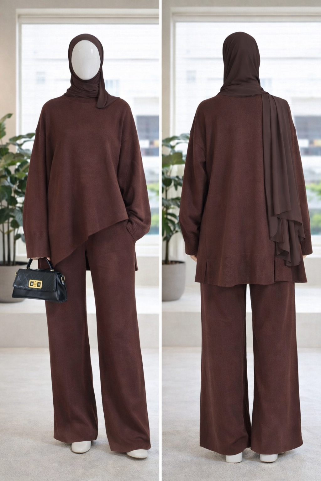 This 2-piece knit set combines style and coziness. The loose-fitting sweater with a slanted hem keeps you warm, while the trousers with an elasticated waistband ensure ultimate comfort. Perfect for relaxed, cold days.